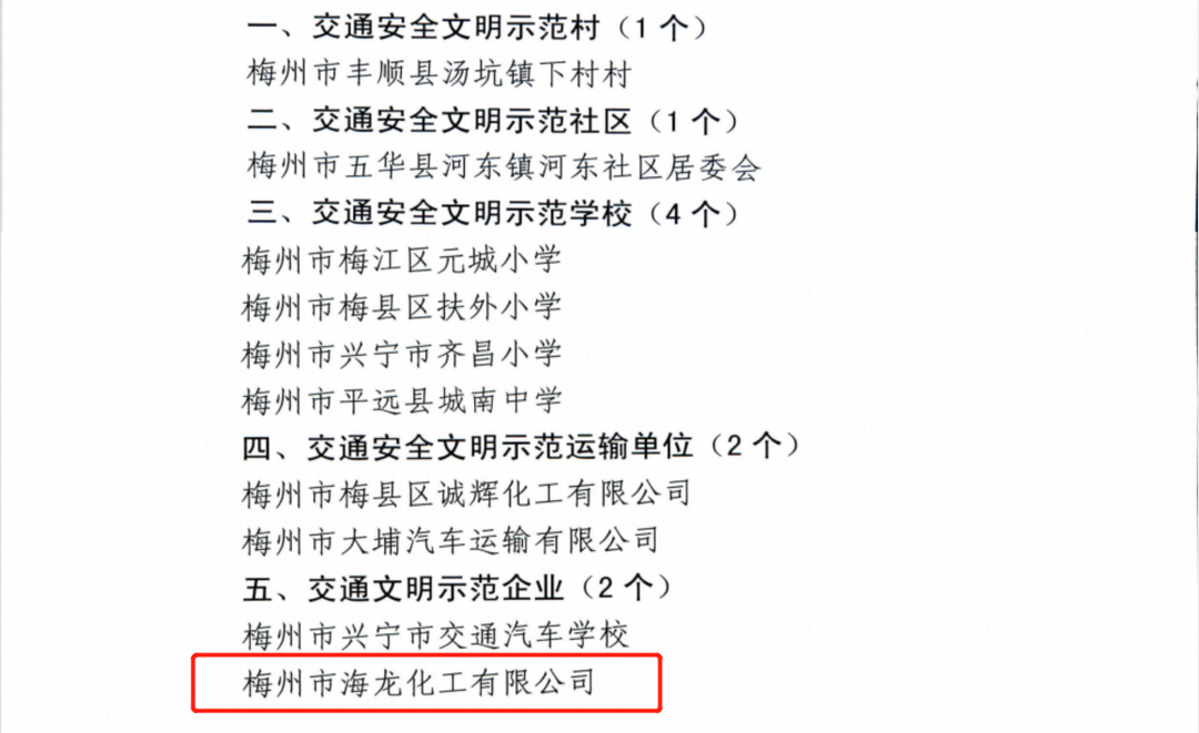 海龍化工積極響應(yīng)交通安全文明要求,自公司成立以來(lái),深耕文明交通行動(dòng)領(lǐng)域,致力于建設(shè)安全文明、和諧有序的道路交通環(huán)境工作,為營(yíng)造文明和諧的城市環(huán)境貢獻(xiàn)力量。公司始終貫徹“安全第一,預(yù)防為主”的安全工作方針,注重交通安全文明建設(shè),通過(guò)加強(qiáng)教育、健全制度,強(qiáng)化監(jiān)督等措施,把交通安全作為公司安全生產(chǎn)中重要的一環(huán),認(rèn)真貫徹落實(shí),嚴(yán)格遵守交通法律法規(guī),實(shí)現(xiàn)了自公司成立以來(lái)無(wú)重大交通事故發(fā)生、無(wú)人員人身傷亡的目標(biāo),確保了生產(chǎn)經(jīng)營(yíng)的正常運(yùn)轉(zhuǎn)。